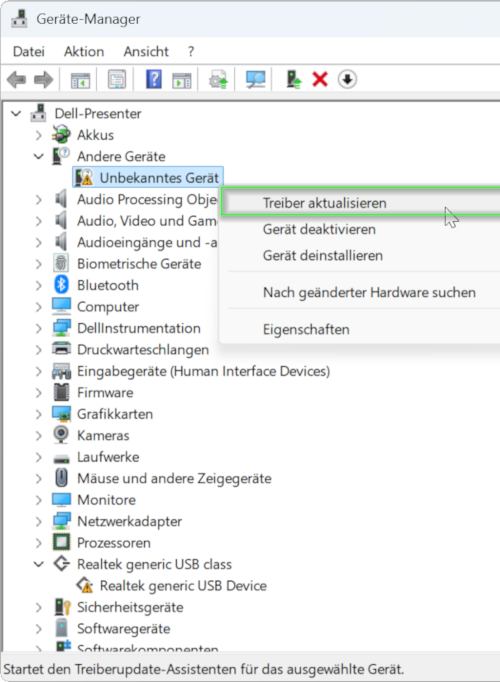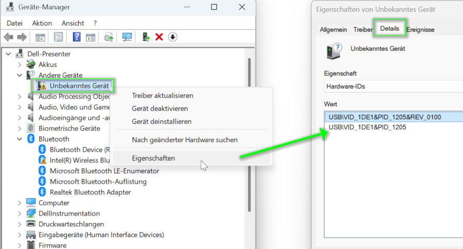 - Sobald das unbekannte Gerät mit der Hardware-ID