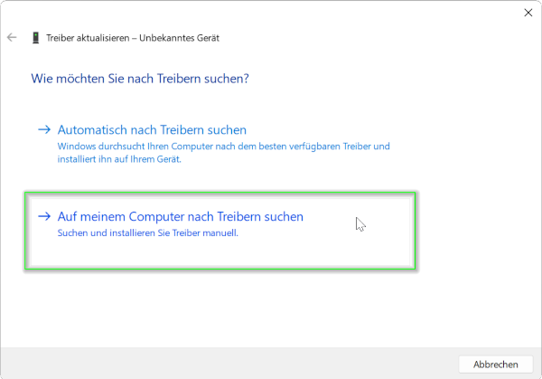- Wählen Sie anschließend die unterste Option „Auf meinem Computer nach Treibern suchen“: