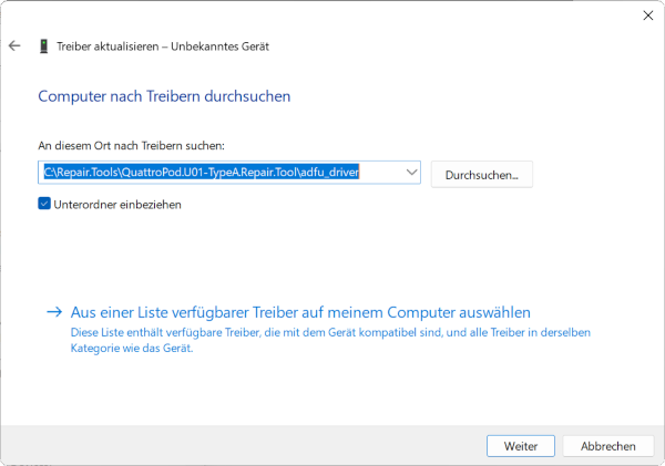 adfu_driverinnerhalb des U01-TypeA Repair Tools und klicken Sie auf „Weiter“: