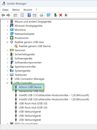 - Nach erfolgreicher Installation erscheint das Gerät „Actions USB Device“ unter der Kategorie „USB-Controller“ im Geräte-Manager: