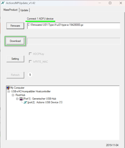 Wenn der QuattroPod-USB-Sender erfolgreich im Type-A-Update-Modus ist, wird im Tool der Status Connect 1 ADFU device angezeigt: